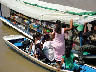 P.S. We gave suckers to the children and on our way back to the boat Don had to have his picture taken with their pet monkey. We also came across the "Boat Store". How would you like to do your grocery shopping this way? :D