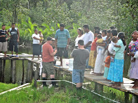 Lots of children received Bible reading books. Here we also gave out medical supplies and of course, we trained them on the advantages of having and using a water filtration system. This village has been plagued with a lot of desease and these filters will be a tremendous step in the right direction to help them. This pictures shows Mark Neitz demonstrating the water system at the dock.